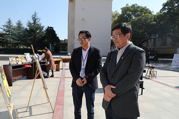 11月12日,信息工程学院结合自身专业设置,组织师生在书香园开展艺术作品展,积极宣传、投身职业教育活动周。党委书记张新春来到现场观看,对学生作品设计方案给予了充分肯定。
