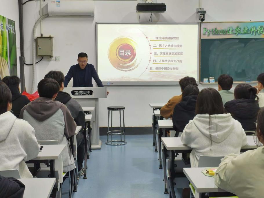 授课中,李建喜以人民衣食住行的变化为切入点,运用详实的数据和耳熟能详的案例,从经济持续健康发展、民主之路越走越宽、文化发展更加繁荣、人民生活极大改善、美丽中国焕发新颜五个方面系统阐述新中国成立75周年来我国所取得的辉煌成就,为学生上了一堂生动而深刻的“大思政课”,并勉励同学们要在推进强国建设、民族复兴伟业中展现青春作为、彰显青春风采、贡献青春力量,奋力书写为中国式现代化挺膺担当的青春篇章。