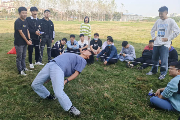 本次活动以寝室为单位,首先开展的是腰力大比拼比赛,以每个寝室成员为一组,每组站一排,室友之间相互扶持,用时最少的一组获得比赛的胜利,而良好的团队配合是制胜的法宝。其次是趣味性较强的趣味蜻蜓点水比赛,参赛者一次取走全部水瓶,就为全中,既锻炼了身体,又增强了团队合作精神,提升了室友之间的信任度,同时也让大家感受到了合作与沟通的重要性,摸石过河比赛将活动氛围带入高潮,游戏参与的过程中需要后方队员的全程指导,用时最少且最快的组获得胜利,这是一个以队员相互信任为主的项目,挑战我们团结协作的能力。通过这些项目,可以感受到队员中的每一位成员都有特殊的价值,在不同的情况下队员之间的优势与弱势是相对的,如果合理使用,它们之间可以互相转换,提高团队完成的效率。荆棘取水,用绳子系住笔,绳子缠绕腰间,通过调整身体上下,将笔放进水瓶,优先完成的寝室获胜。